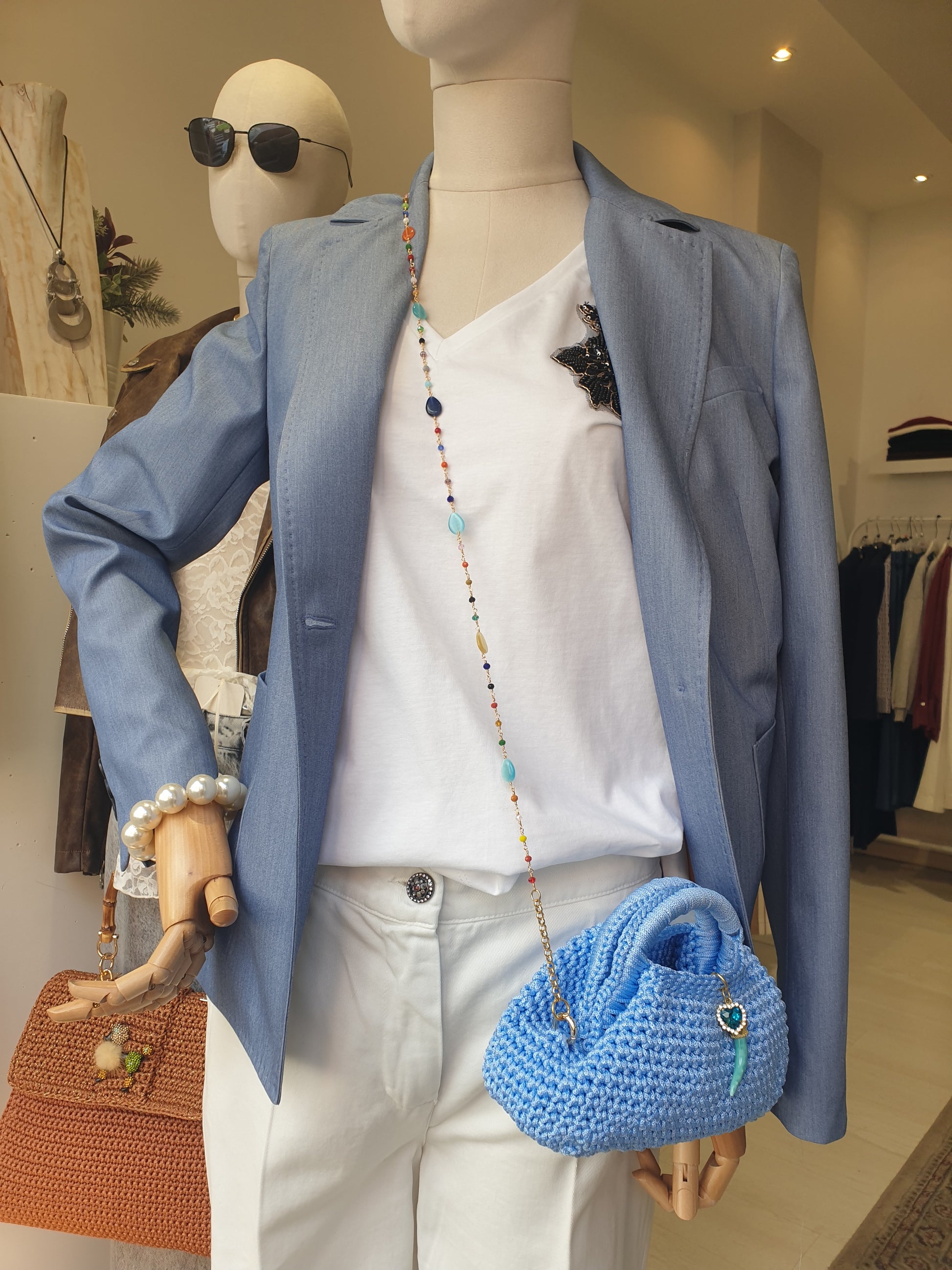 Borsa fatta a mano 100% made in Italy, lavorata ad uncinetto con filo in cotone e seta,foderata in tinta. Chiusura a molla dal manico, tracolla colorata in perline