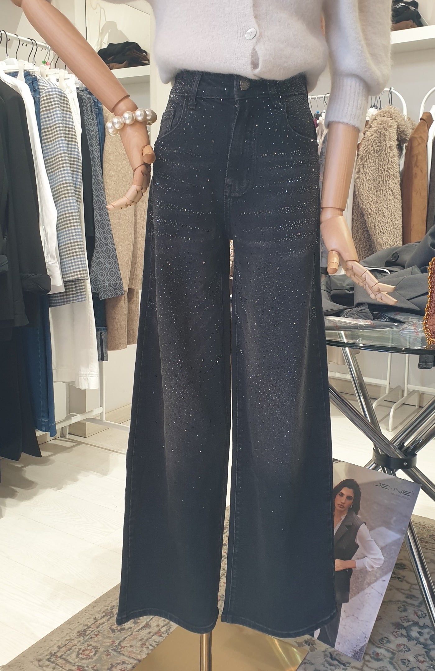 Novità 2025! Jeans variante nera xon inserti in micropaillettes. 5 tasche, lavaggio nero delicato, leggermente palazzo, vestibilità regular