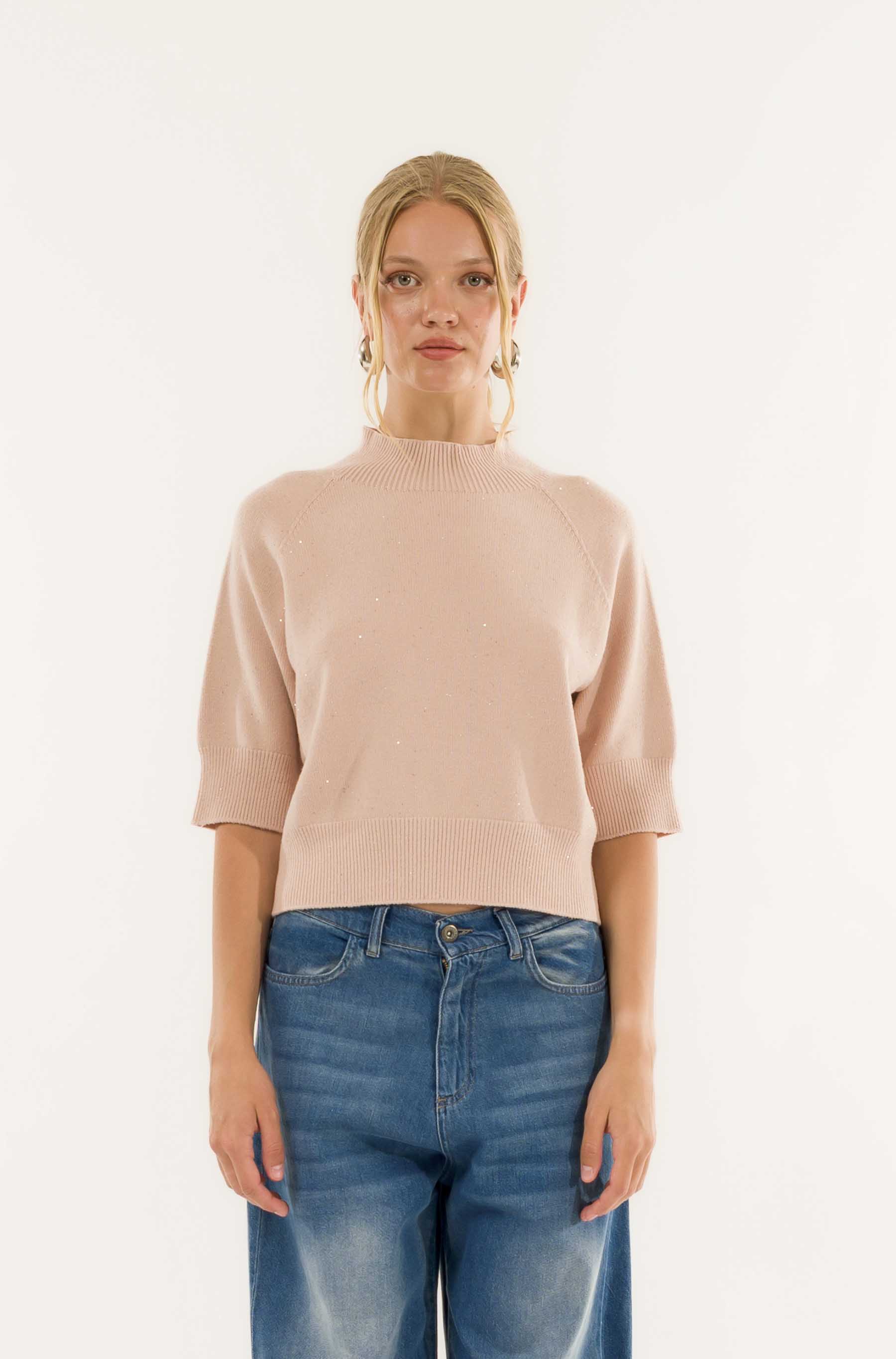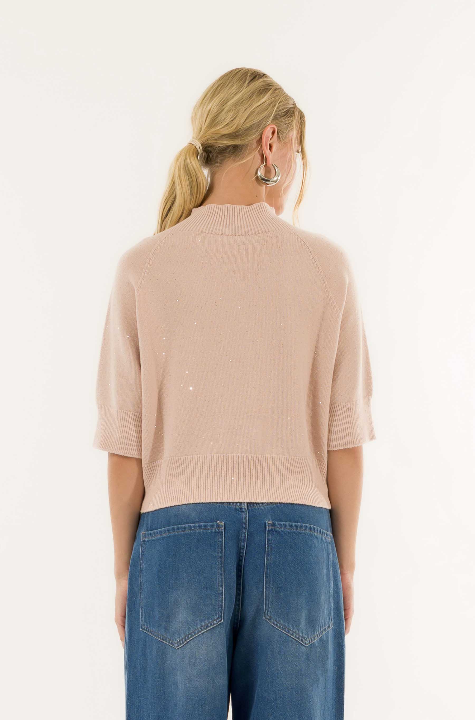 Novità 2025! Maglia con inserti in micropaillettes, collo a lupetto,manica svasata a 3/4, vestibilità morbida