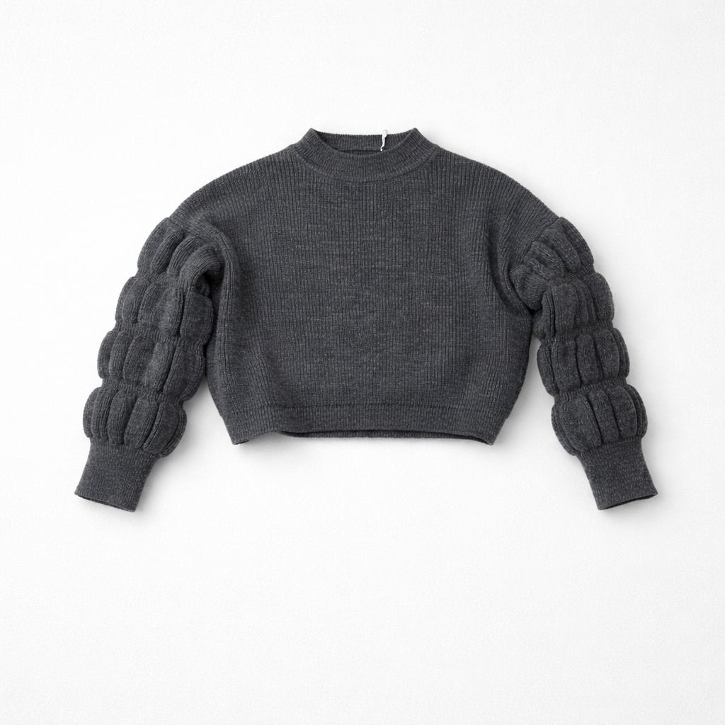 Maglione con taglio leggermente crop, maniche a rilievo con sbuffi che lo rendono particolarissimo. Molto caldo grazie all'alta percentuale di lana.Taglia unica