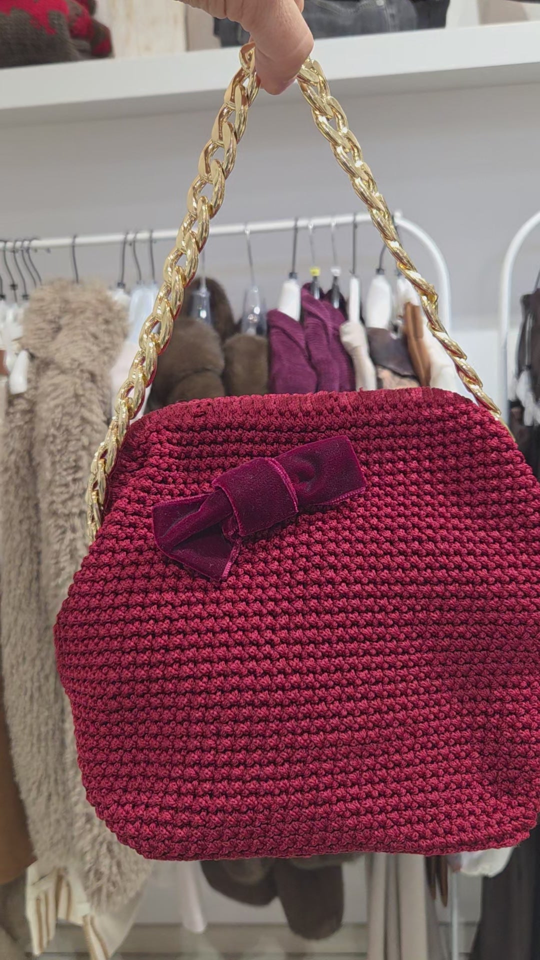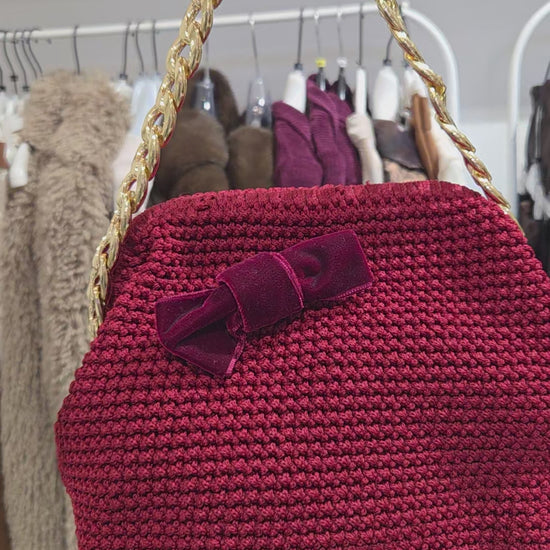 Novità inverno 2025! Meravigliosa borsa all'uncinetto, chiusura clutch a molla, in filo di cotone e seta, catenella color oro, fiocco in velluto liscio