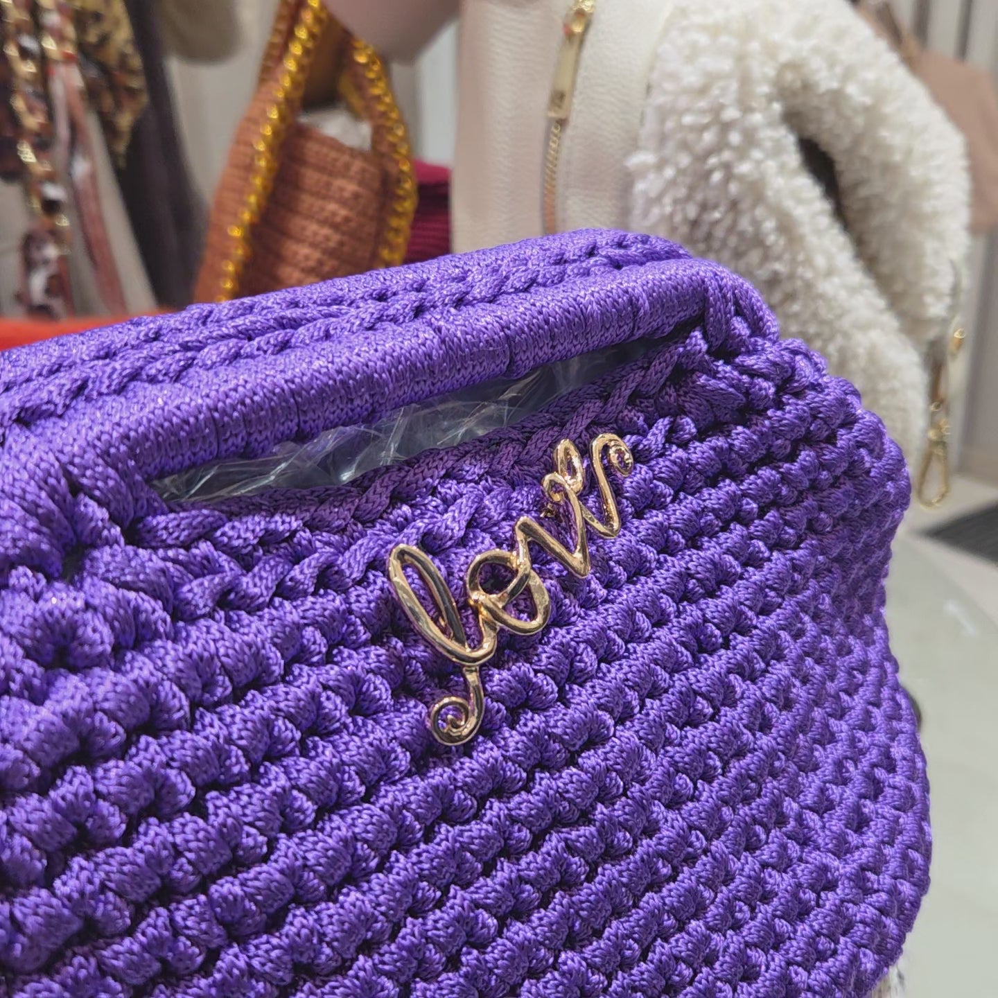 Novità 2025! La borsa violet è interamente realizzata a mano con fili in cotone e seta, manico piatto con chiusura clutch a scatto. Tracolla corta staccabile
