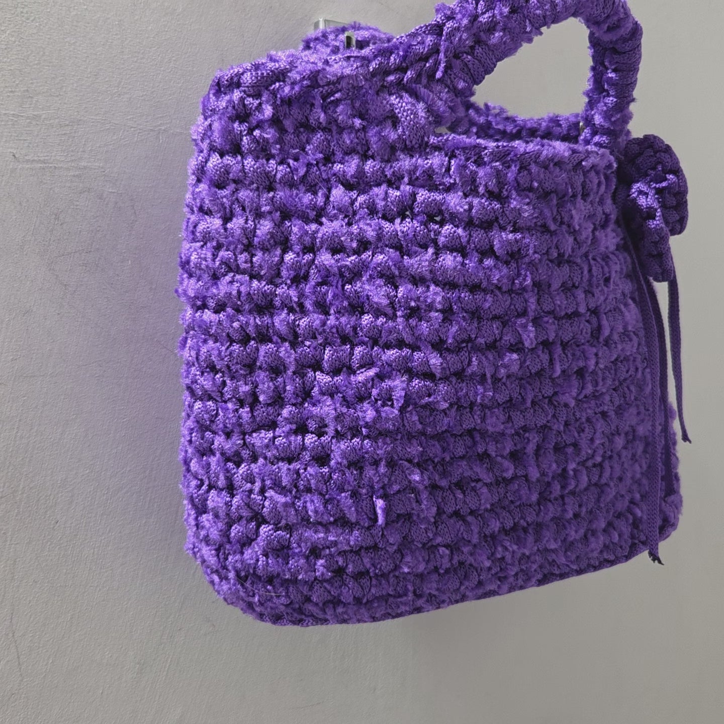 Best seller del 2025! Borsa fatta a mano con fili di cotone, seta e lana. Colore viola acceso, manico corto e fiori a rilievo fatti a mano! Nessuna clip di chiusura, nessuna fodera interna